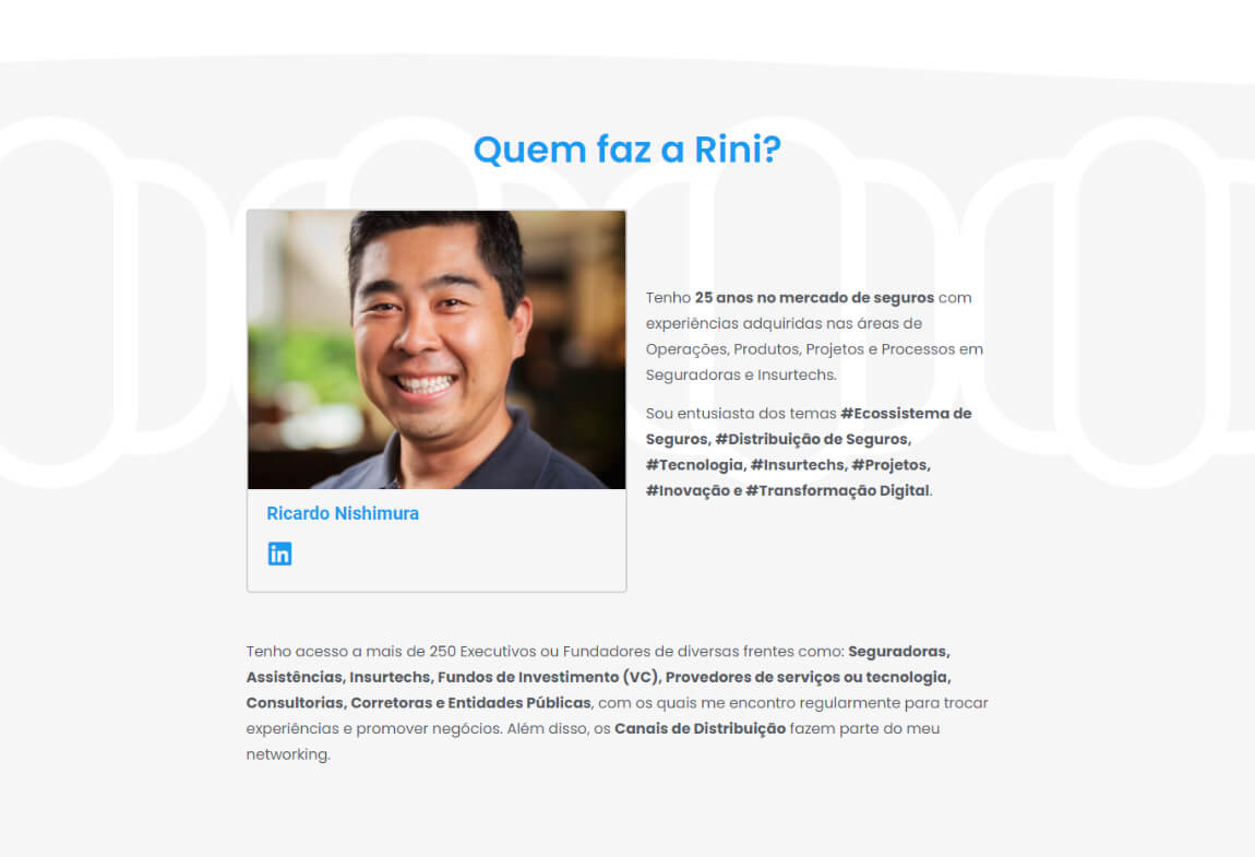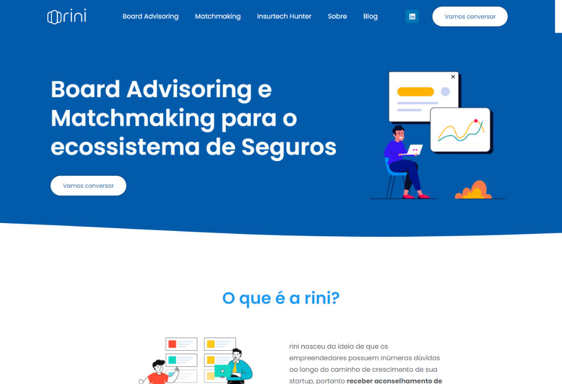 Site fluído e com uso de ilustrações e ícones para representar melhor o contexto de trabalho oferecido pela Rini, respeitando as diretrizes da marca e sua paleta.