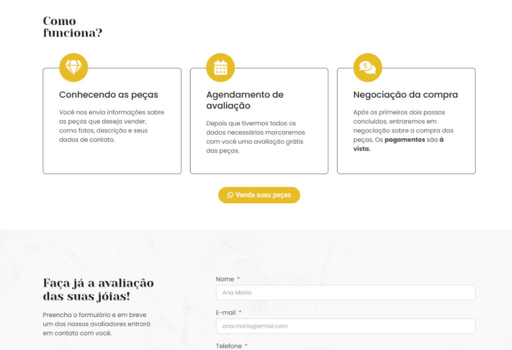 Um site página única atendendo um objetivo de conversão para avaliação de joias. Com detalhes visuais simples mas de impacto.